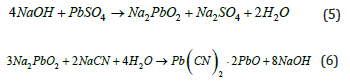 Table 1 reveals that Au, Ag, Fe, Cu, and Zn cyano complexes exhibit high stability constants. These metals increase cyanide and oxygen consumption, complicate solution purification [5], and hinder pure Dore production. Consequently, maintaining low alkali concentrations during cyanidation less than pH 11 is crucial to prevent excessive alkaline plumbite formation, which reacts with cyanide to produce insoluble basic lead cyanide [6] (see equations 5 and 6).