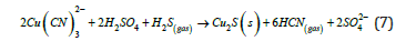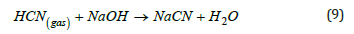 Utilizing this method, 99% copper recovery is feasible. Released HCN gas from barren solutions is stripped and then captured in a NaOH alkali solution, as depicted in the following reaction (9) :