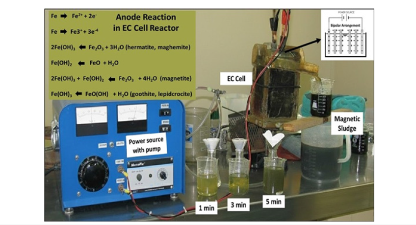For wells water treatment with toxic ions metals (As and Pb) in La Region Lagunera in Mexico, this electrochemical phenomenon is ideal, because a reactor for any capacity of effluent treatment plant can be designed. It is an environmentally friendly process since needs low current, and therefore, can be operated by green technology, such as, windmills, gravity, geothermal or solar energy. Also, the magnetic sludge is more readily filterable and can be utilized as a product to make semiconductors/permanent magnets [1]. The EC process needs minimal star up time; the process can be started by turning on the switch.
