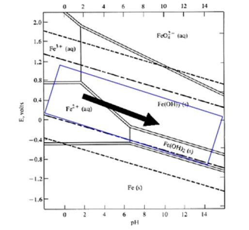 Figure 5:Iron Pourbaix Diagram, showing the region and direction in which, the EC process proceeds.