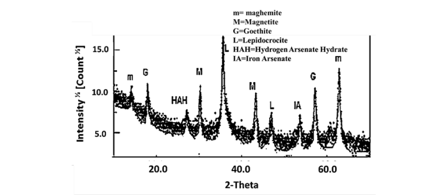 Diffractograms were obtained with a Philips X’Pert MPD system operating with CuKα radiation source filtered with a graphite monochromator (λ=1.5406 Å). The spectrum scan rate was set at 0.02 degrees per sec. For the arsenic magnetic species, a diffractograms was obtained with a Bruker-AXS D4 Endeavor diffractometer operating with CuKα radiation source filtered with a graphite monochromator (λ=1.5406 Å). The samples were ground to a fine powder in isopropyl alcohol (Sigma-Aldrich) and loaded into a sample holder. The XRD scans were recorded from 20 to 70 degrees 2 with 0.020 step-width, and with 10 sec counting time for every step-width. Experiments were run at 40kV and 40mA. Figure 8 shows the diffractogram of arsenic sample obtained from a solution at pH 7 (solution was containing 0.005ppm arsenic). The species identified were magnetite, goethite, lepidocrocite, iron arsenate and iron hydroxide oxide in crystalline form Figure 8.