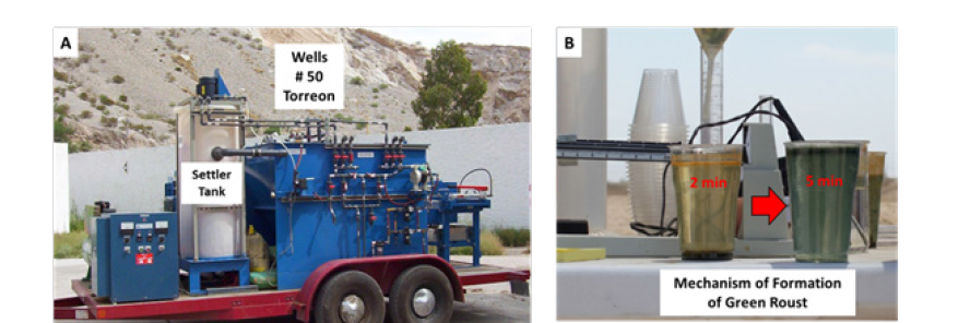 Figure 9:A) Pilot plant (40 liters/minute) in wells # 50 in UAT Torreon and B) Mechanism of formation of green roust simples.