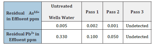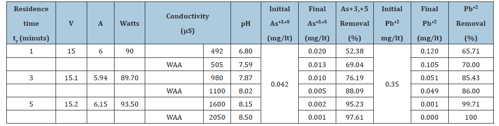 The variation of pH during electrolysis is given in Figure 6. The pH of the effluent increases during the electrocoagulation process and levels off at a value approaching pH of 8.5. The increase in pH is due to the formation of hydroxides during hydrogen evolution at the cathode surfaces in the EC apparatus. Optimum operating conditions for the bipolar EC unit were developed from a number of studies and are summarized in Table 3. Removal of more than 99% of arsenic and lead are demonstrated in this research with these conditions. A pictorial and tabular summary of the results of the Electrocoagulation performance test on wells water with arsenic and lead solution. The EC process with air injection has clearly demonstrated that, it is worth noticing that the wastewater probably could have been disposed after the second pass.