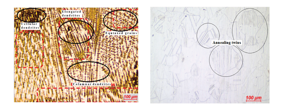 After the welding process using ERNiCrMo-4 welding filler wire and argon gas protection, it was observed that the welded similar Hastelloy C-276 alloys did not have any defects or discontinuities and had high welding quality. In addition, microstructure analyses, features such as dendritic structures, grain boundaries and annealing twins are thought to play a critical role in increasing the mechanical strength of the material and providing ductility [21,22], (Figure 1).