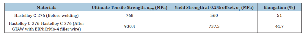 Table 2:Tensile values of the structure obtained by welding two similar Hastelloy C-276 with method GTAW and without welding.