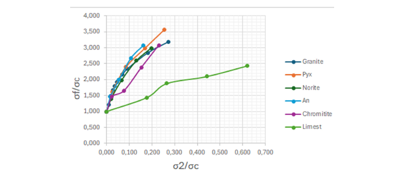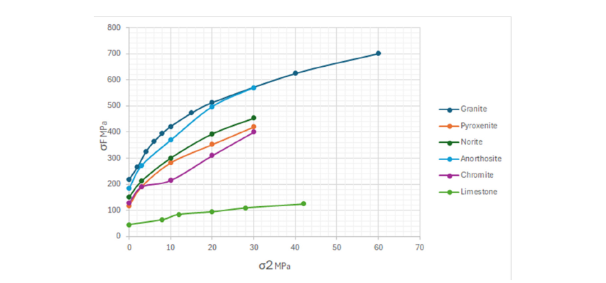 Figure 1:Plot of strength curves for Granite, Pyroxenite, Norite, Anorthosite, Chromitite and Limestone.