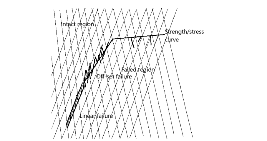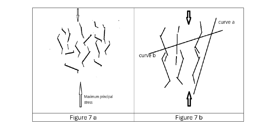 Geometries 1 and 2: Microcracks will initiate but cannot coalesce in the optimal direction and will terminate on the strength curve. As the strength curve continues to extend upwards, microcracks of limited extent will be created resulting in weaker/softer material without obvious fracture zones, “Failed” region. In geometry 3 the microfractures can coalesce in the direction of the optimal orientations creating fracture zones of limited extent creating an off-set pattern. Geometry 4 illustrates the coincidences of the optimum orientations with the strength contour over extended length and a narrow resulting in a narrow and extended failure surface. Geometry 5 fractures are created the same as In off-set geometry 3 but in the opposite orientation. Figure 10 illustrates the effect of a slight variation in the stress/strength curve orientation the fracture pattern is changed significantly. All of the above geometries can have mirror images creating an apparently greater number of possible configurations.