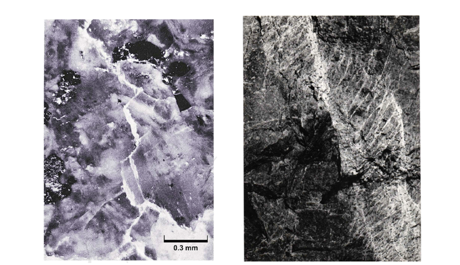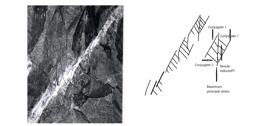 The fracture process described above is scale independent; it reflects the process from microcrack scale to tectonic deformation; the mechanism remaining the same. Small fractures create bigger fractures with increase and consistency of the loading system. Figure 11 is picture of a burst fracture with an associated schematic copy as well as the definition of the different fractures. The off-set pattern has two causes: