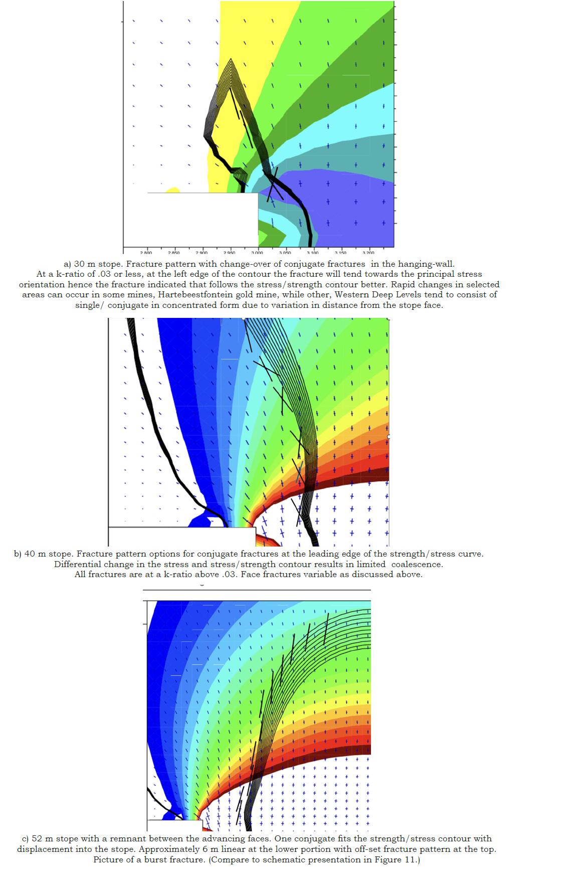 Figure 14 is a close up of the individual predicted fracture geometries with increase in the stope span. The optimum orientation of the conjugate fracture systems is calculated in the FLAC2D program and contours can be drawn but are not easy to visualise, instead the main components affecting the fracture orientation, the k-ratio, strength/stress contour and the principal stress orientations are used in an attempt to illustrate the resulting fracture orientation. The superimposed fracture surfaces based on an approximate angle of plus or minus of 250 to the principal stress orientation. (The data is accessible for every grid-point in the FLAC2D program, and the schematic orientations given in Figure 14 can be plotted in detail, but the combination thereof is beyond the programming capability of the author and needs to be included in the program). The predicted patterns have been observed extensively in the mines, and it is concluded that the simplistic FLAC2D program be improved.