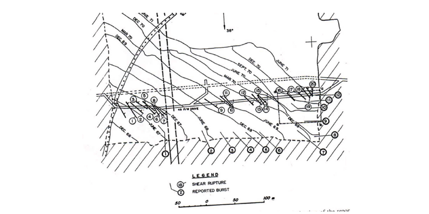 Due to rapid changes in the stress orientation, stress magnitudes and k-ratios different fractures will be formed in the immediate vicinity of the stope face. Most of the fractures will have a limited length and change in orientation. This has been observed in all of the mines and is well documented. What is also well documented is the intensity of micro-seismicity in the immediate vicinity of the stope face. It is concluded that all fracturing will be associated with seismicity, (acoustic emissions in specimen), and that the magnitude of the seismic event is dependent on the extent of individual fracture coalescence; the greater the coincidence between the orientation of the strength/stress contour=1 and the critical crack orientation, the greater the seismic emission. Kersten [6] described a stress/failure setting that seemed to indicate that rock bursts, mine induced, can be predicted. Figure 15 is a copy of a mine plan, Ortlepp [7], showing the face positions and observed burst fractures.