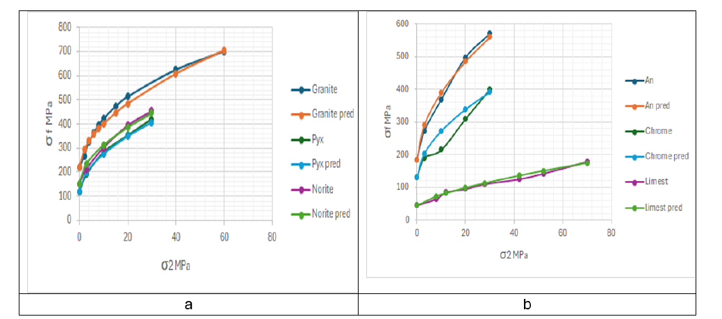 Figure 3:Plot of Laboratory results compared to predicted strength values using equation 4, a. for Granite, Pyroxenite and Norite. b. Anorthosite, Chromitite, and Limestone.