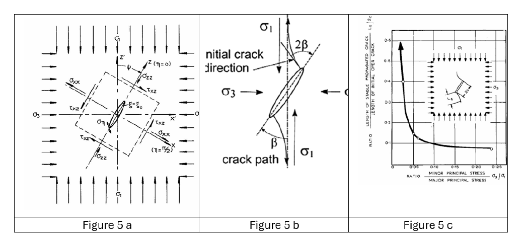 Figure 5 summarises the classic Griffith criterion, Hoek et al. [3,4] and its limiting value at a k-ratio (minimum/maximum principal stress) of .03. Beyond this value the original or modified Griffith criterion is not applicable anymore; the failure mechanism still follows the critical/optimum stress orientation of the microcrack, but crack coalescence cannot be based on induced wing cracks. Figure 5a depicts the essence of the generally accepted Griffith failure criterion for calculating the orientation of the optimum/critical angle of a microcrack. Figure 5b illustrates the failure mechanism due to induced tensile failure at the crack tips creating secondary fractures with lengths given in Figure 5c. Note that the length of the induced tensile crack reduces to zero and an alternative process takes over; the optimum crack orientation stays the same but the relative displacement in the microcrack surfaces is apparently reduced by the increase in the frictional resistance causing a change in the fracture mechanism and the resulting fracture appearance. Figure 6 illustrates the difference in fracture appearance with the change in k ratio at 0.03.