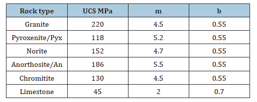 Figure 2 are strength curves obtained using equation 3 with controlled variable/constants for the rock types shown in Table 1.