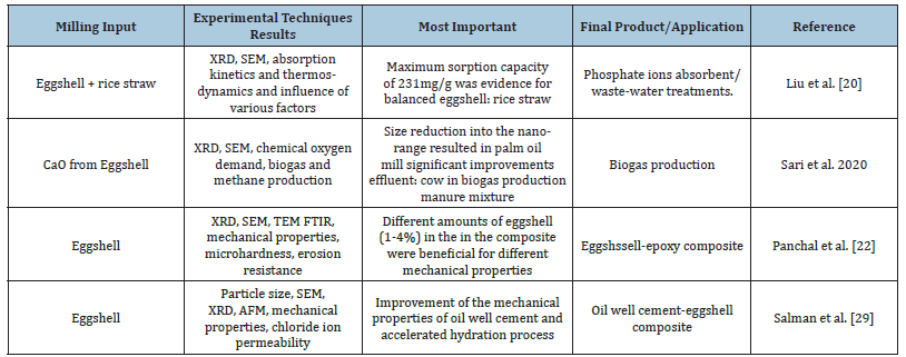 Table 2:Examples of the use of eggshell waste reported by Baláž et al. [10].