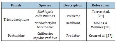 The order Testudines covers species commonly known as turtles, such as tortoise, terrapin or pond turtles and sea turtles. In South America, L. fortunei share the same environment with freshwater turtles (terrapin), which have two main families: Chelidae and Emydidae which have already been described as predators of golden mussels. The first record of a predatory relation between freshwater turtles and the golden mussel was reported by Bujes [25], who discussed the composition diet of Trachemys dorbigni, which included golden mussels. Moreover, some terrapins have the potential to disperse the L. fortunei by epibiosis, which will be discussed later in this review [25]. Cardoso [26] described the relation between four species of testudines (Table 1) and the golden mussel, considering prey and dispersion. According to this study, the predators Trachemys dorbigni and Phrynops hilarii presented high numbers of the golden mussel in its diet. Besides which, the consumption of golden mussels by these testudines was constant, indicating that feeding on these mussels was already a diet pattern. Nevertheless, the study did not elaborate on the shell status, thus it is not possible to classify these testudines as predators or dispersers at this time. An uncommon group of animals that have a new and recent relation with golden mussels are arthropods from Decapoda order. These animals are mainly omnivores and can prey or exhibit an epibiont behavior with golden mussels (Table 2). Decapoda has seven families detected in South America which two of them described as L. fortunei predators (Portunidae and Trichodactylidae). These two families of crabs have chelipeds with the function of defense and predation, being able to break the mussel’s shell or open it to expose the soft tissue, digest this and then, regurgitate the rest of valves [27,28]. One species described as a basibiont is Trichodactylus borellianus [27-30]. They are smaller than golden mussels and, in this case, the size differences are significant because a single mussel can limit T. borellianus movements, reproduction and feeding, causing an imbalance in the native population. Aside from the aforementioned characteristics, T. borellianus has the same diet as golden mussels, both feeding on protozoa, rotifers, copepods and algae which promotes competition between them [28].