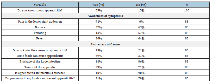 In this study, a total of 100 female students from the student dorm at M.O Saror, Almatama, River Nile State, Sudan, were interviewed. The demographic characteristics of the respondents are summarized in Table 1. The majority of participants (67%) were aged between 20 and 25 years, while 33% were younger than 20 years. The findings revealed that 16% of the participants had experienced appendicitis within the year 2021. When asked about their awareness of appendicitis, 85% of the participants were familiar with the disease, though there was variation in their understanding of its symptoms, causes, and preventive measures (Table 2).