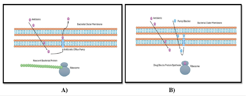 Figure 2:Bacterial efflux system: A) Antibiotic interfering with protein production by ribosomes. B) Antibiotic interfering with protein production by ribosomes [19,17].