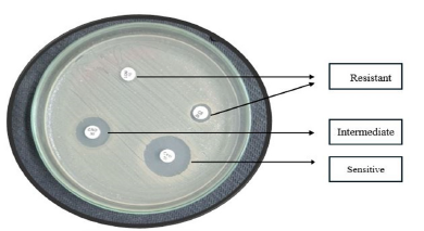 Disc diffusion is the process of applying commercially available drug-impregnated filter paper discs to the surface of an agar plate that has been injected to confluence with the target organism [31]. The Kirby-Bauer antibiotic test is another name for disc diffusion. The medication diffuses radially through the agar, with its concentration dropping logarithmically as the distance from the disc increases. This causes a growth inhibition zone to form around the disc, the diameter of which is inversely proportional to the MIC. The organisms are described as susceptible, intermediate, or resistant, and the zone diameters are interpreted using the recommendations that CLSI has provided. Only quickly developing organisms-for which zone size interpretation criteria are available-can be tested using disc diffusion. The Minimum Inhibitory Concentration (MIC) for that specific bacterial strain is correlated with the diameter of the zone of inhibition surrounding the antimicrobial disc; the zone of inhibition and the test bacterium’s MIC have an inverse relationship. Generally speaking, the bigger the zone of inhibition, the less antibiotic dose is needed to stop the organisms from growing [32]. The Minimum Inhibitory Concentration (MIC) for that specific bacterial strain is correlated with the diameter of the zone of inhibition surrounding the antimicrobial disc; the zone of inhibition and the test bacterium’s MIC have an inverse relationship. Generally speaking, the bigger the zone of inhibition, the less antibiotic dose is needed to stop the organisms from growing [5]. To conduct a disc diffusion test, a large (150mm diameter) Mueller-Hinton agar plate is coated with a bacterial inoculum of roughly 1-2×108CFU/ ml. Every antibiotic disk’s surrounding zone of growth inhibition is measured to the closest milli meter. The medication’s diffusion rate through the agar medium and the isolate’s susceptibility are shown by the zone’s diameter. Based on guidelines published by the Clinical and Laboratory Standards Institute (CLSI0), the zone widths of each medical treatment are interpreted. As a type of susceptibility (i.e., susceptible, intermediate, or resistant) (Figure 3) rather than a Minimum Inhibitory Concentration (MIC) is obtained from the disc diffusion test, the results are “qualitative” [28]. Not expensive equipment is needed, and the test is simple to conduct and reproducible. Measured with calipers or a ruler, the diameter of the zone of growth inhibition is recorded in millimeters [33].