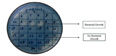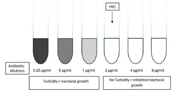 Using the broth dilution approach, the isolate is exposed to a range of antimicrobial agent concentrations in a broth-like medium. Micro dilution testing can be easily carried out in a micro titer format and requires 0.05 to 0.1ml of total broth volume. Standard test tubes are filled with broth at a volume of roughly 1.0ml for macro dilution testing. The least inhibitory concentration, or MIC, for each broth dilution procedure is the lowest concentration at which the isolate is totally inhibited (Figure 4), [34] Therefore, the lowest concentration of the antibiotic that will prevent this isolation is known as the minimum inhibitory concentration, or MIC. The Minimal Inhibitory Concentration (MIC) approach is another name for the broth dilution method of testing for antibiotic susceptibility. A set volume of nutrient broth with a standard concentration of bacteria is added to test tubes or wells holding escalating quantities of each antibiotic to be tested, ranging from 0.0312 to 512μg/ml. Every tube contains twice as much antibiotic as the one before it [34]. A culture tube containing non-selective broth medium is filled with an antibiotic at various doses for the broth dilution assay [17]. For 16 to 20 hours, tubes are incubated in ideal conditions for the test microorganism. Spectrophotometry or plating counts are two methods that can be used to measure the antimicrobial action [35].