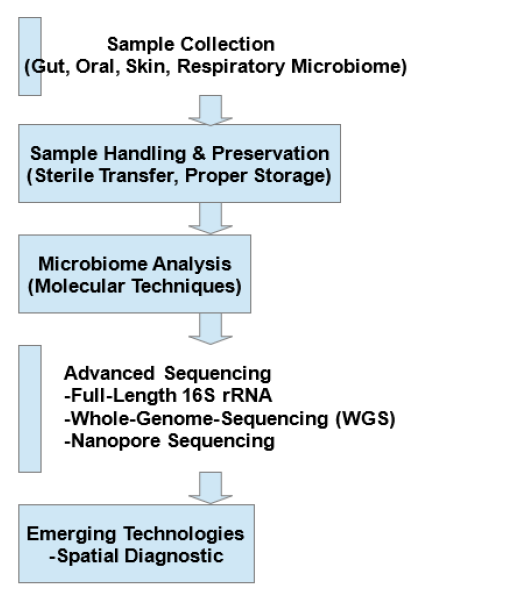 Figure 1: Microbiome profiling workflow. The flowchart outlines the process of microbiome profiling, beginning with sample collection from the gut, oral cavity, skin, and respiratory sites. Samples are collected using sterile techniques, preserved and preferably maintained at low temperature, depending on the sample type, prior to molecular analyses. Sequencing approaches such as 16S rRNA gene sequencing and shotgun metagenomics are employed to identify microbial communities within samples. Methodological advances, including full-length 16S rRNA sequencing, Whole-Genome Sequencing (WGS) and nanopore sequencing, have further enhanced the resolution and accuracy of microbiome profiling. Ultimately, spatial diagnostic approaches provide deeper insights into host-microbiome interactions.