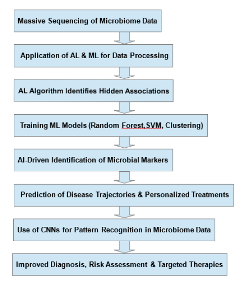 Moreover, Convolutional Neural Networks (CNNs) are highly useful for analyzing complex microbiome data, especially highdimensional sequencing reads [73,74]. CNNs learn to identify unique patterns that distinguish microbial populations from one another so that they can be classified into distinct groups such as healthy and ill. CNNs would probably improve the discovery of microbial signatures that are associated with particular diseases because they learn the hierarchical relationships between taxa. In metagenomics, CNNs analyze large sequencing data to link microbial patterns with clinical outcomes, improving disease risk assessment [75,76]. Automated selection of key microbes and identification of disease-related traits will enhance diagnostic and treatment accuracy. CNNs and ML together help study microbes and their effects on health [77,78]. Figure 2 illustrates, in a flowchart format, the role of AI and ML in microbiome research, from data processing to disease prediction.