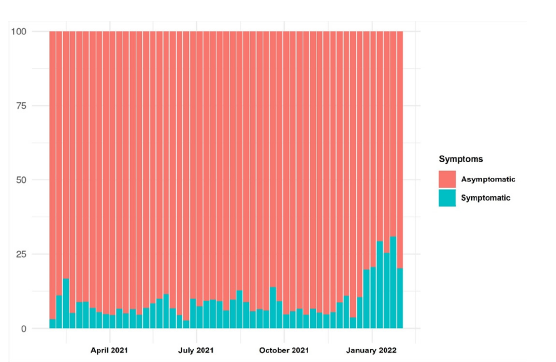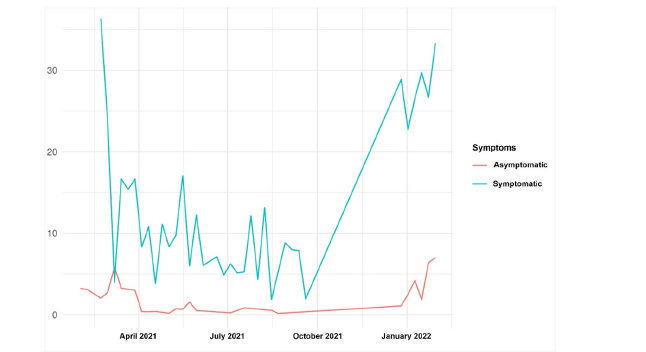 Figure 6:Distribution of positivity by symptoms per week (%).