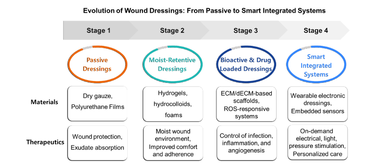 Figure 1:Schematic illustration of the evolution of wound dressings from passive to smart integrated systems. Stage 1 dressings (dry gauze, polyurethane films) provide basic wound protection and exudate absorption. Stage 2 moist-retentive dressings (hydrogels, hydrocolloids, foams) maintain a moist environment and improve comfort and adherence. Stage 3 bioactive and drug-loaded dressings (ECM/dECM-based scaffolds, ROS-responsive systems) enable localized control of infection, inflammation, and angiogenesis. Stage 4 smart integrated systems (wearable electronic dressings with embedded sensors) deliver on-demand electrical, light, and pressure stimulation to support personalized wound care.