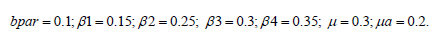 Bifurcation results: When β1 is the bifurcation parameter a branch point occurs at (sv,pv,av, β1) values of (0.333333 0, 0, 0.9) (Figure 1a)