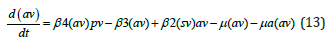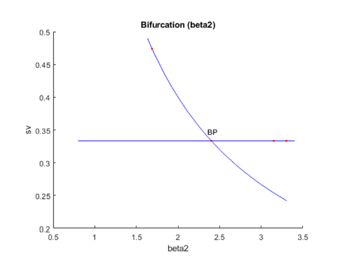 When β 2 is the bifurcation parameter a branch point occurs at (sv,pv,av, β 2 ) values of (0.333333 0 0 2.4) (Figure 1b). Here, the two distinct functions can be obtained from the third ODE in the model