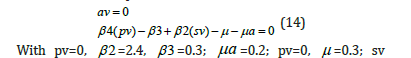 With pv=0, β 2 =2.4, β 3 =0.3; μa =0.2; pv=0, μ =0.3; sv =0.33333, both distinct equations are satisfied, validating the theorem.