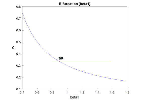 Fgure 1a:Bifurcation diagram (β1 is the bifurcation parameter) revealing a branch point at (sv,pv,av,β1) values of (0.333333 0, 0, 0.9).