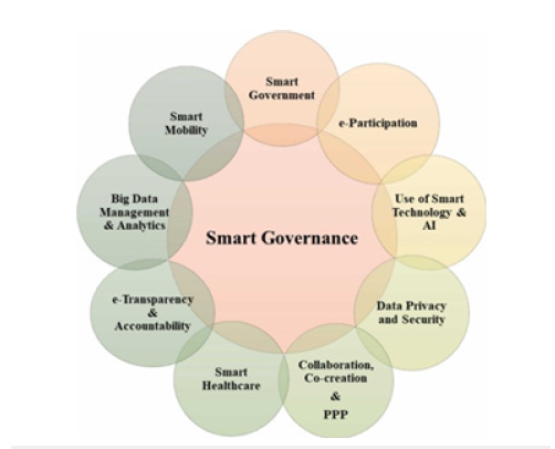 Smart governance and smart cities: Smart governance plays a pivotal role in shaping the development and sustainability of smart cities by integrating advanced technologies, administrative efficiency, and participatory mechanisms into governance structures (Figure 2) [31]. It is an evolution from traditional governance frameworks, where ICTs form the backbone to ensure efficiency, transparency, and inclusivity in government operations [32]. The components of smart governance include the deployment of advanced tools such as artificial intelligence, machine learning, blockchain, big data analytics, and the Internet of Things, which enhance real-time decision-making and streamline public service delivery [33]. These technologies provide governments with the ability to manage vast datasets efficiently, predict future needs, and implement policies that directly improve citizen services [34]. However, the role of smart governance is not restricted only to technological adoption but also to ensuring citizen participation, inclusivity, and accountability in governance processes [35]. By embedding principles (Figure 2) of transparency, accountability, and democratic engagement, smart governance ensures that the transformation of cities does not remain a purely technological endeavor but also fulfills social, economic, and ethical objectives [36]. It acts as a mechanism that bridges the gap between citizens and governments through both one-way and two-way communication channels, fostering collaborative approaches in policy-making and governance [37]. In this context, governance becomes more dynamic, adaptive, and responsive to urban challenges, addressing not only efficiency but also the broader goal of equitable growth and sustainable development in smart cities.