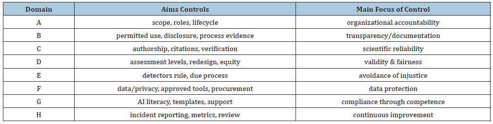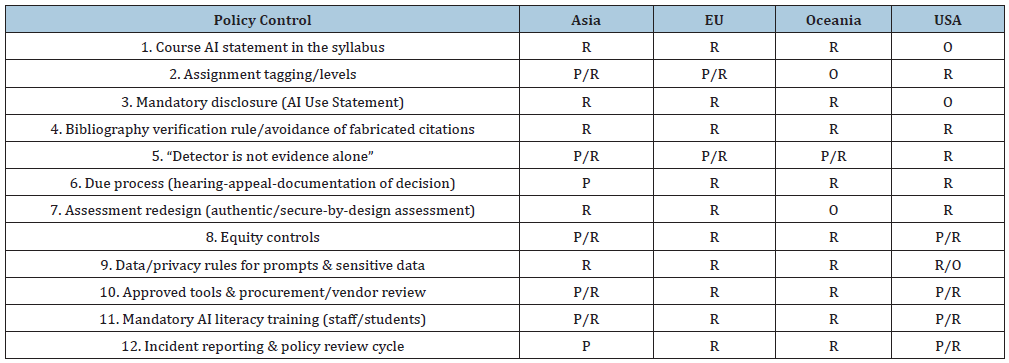 Accordingly, Table 2 presents recurring controls alongside an indicative picture of policy maturity by geographical region. The codes R/P/O denote whether a given control typically appears as Required, Present, or Optional. This comparative logic makes it possible to distinguish between largely rhetorical adoption and operational implementation, particularly for controls that demand sustained resources (e.g., procurement review or incident learning mechanisms) or substantive changes in assessment practice (e.g., assessment redesign).