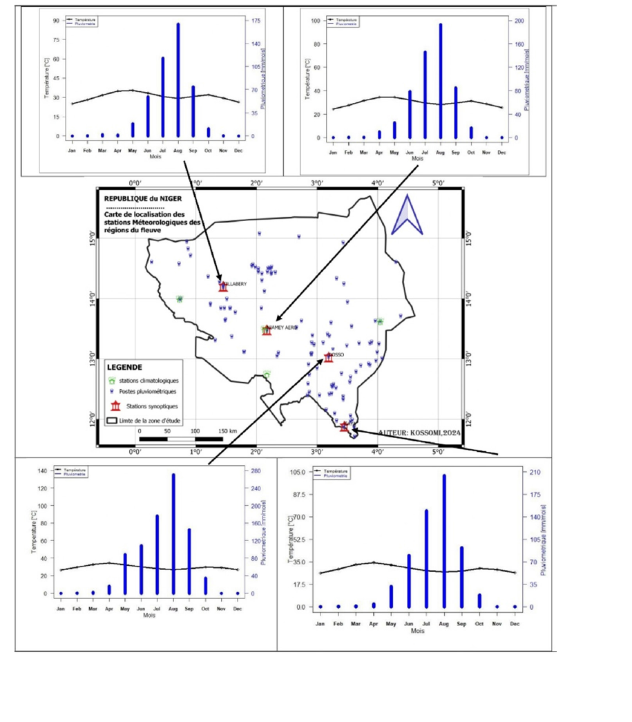 Agroclimatic analysis of the Niger river regions highlights significant variations in precipitation and temperatures over recent decades. Indeed, the synoptic stations studied reveal an overall decrease in precipitation in Dosso, Niamey and Tillaberi regions, while Gaya shows a slight, non-significant increase. Furthermore, the study sites are experiencing temperatures rising trend, accompanied by significant abrupt changes in the time series. These figures influence the start and end dates of the rainy season, increasing the risk of water stress, particularly for pearl millet crops. Finally, the correlation observed between the late end of the season and its length highlights the need to integrate these dynamics into agricultural planning for better productivity to order to cope with the effects of climate change and ensure food security for rural communities.