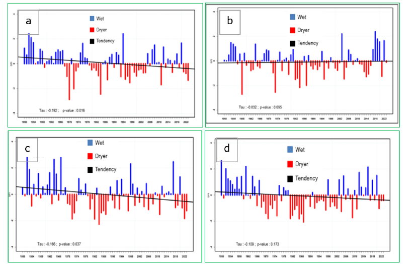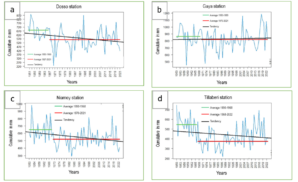 For interannual variability (Figure 3), of precipitation, (Figure 3a), a downward trend in precipitation with a significant abrupt change (P-value=0.008) was observed in 1967 in Dosso synoptic station. The analysis highlights the first series from 1950 to 1967 with an average of 680mm characterizing the wet period then the second series characterized by a deficit of 122mm (18%) from 1968 to 2023 with an average rainfall of 558mm (Figure 4). It should be noted that years with the highest rainfall are observed in 1953, 1954, 1976 and 1994 but the rainfall are decreased in 1970, 1972, 1984 and 2011 (Figure 4a). In Gaya synoptic station (Figure 3b), a slightly increasing trend of annual rainfall was observed. Results showed a non-significant abrupt change (P-value=0.541) in 1970 which divides the series into two series: A first series from 1950 to 1969 with an average of 862mm and a second from 1970 to 2023 with an average of 817mm, characterized by a decrease of 45mm or 5%. We can notice significant accumulations above the averages in particular in the years 1953, 1964, 2003, 2018 and 2019 but also accumulations below the normal observed in 1958, 1973, 1984 and 1987 (Figure 4b). At the Niamey synoptic station (Figure 3c), a downward trend in precipitation with a significant abrupt change (P-value=0.024) was observed in 1969. Due to this abrupt change, two data series were found. For the first series from 1950 to 1969, the average precipitation was 648 mm indicating wet years conditions observed particularly in 1953, 1965, 1968, 1998 and 2017. The second series showed rainfall deficits from 1970 to 2023 with an average rainfall of 520 mm, thus indicating a decrease of 128mm (19.7%) driest conditions in 1972, 1982, 1984 and 2022 (Figure 4c).