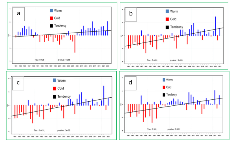 With regards to Tillaberi synoptic station (Figure 3d), a downward trend in annual precipitation with a significant change point (P-value=0.003) detected in 1967, producing two series: the mean annual precipitation for the first series from 1950 to 1967 was 544mm and 372mm for the second series from 1968 to 2023. A decrease of 172mm (corresponding to 32%) was noticed. Results revealed also years marked by significant increase in rainfall such as 1950, 1952, 1961, 2012 and 2016 while benefiting some food crops like millet, rice, wheat and maize. The years of considerable declines as well: 1971, 1981, 1987 and 2009 (Figure 4d). During this period, decreased crop yields and other negative impacts on local agriculture and food supply were noted. Rainfall is the main climatic parameter characterized with great spatial-temporal variations. According to our results, it appears that cumulative rainfall tends to decrease in all the studied stations. This trend is in line with the conclusions of Moron (1996), who observed a decrease in precipitation between 1968 and 1993 in the Sahelo-Sudanian zone. A decrease in precipitation in the study area leads to drought and water shortage, negatively impacting local agriculture production, ecosystem’s services and water availability. Those factors are main parameters in the area for the food insecurity. Temperatures are the second most important climatic variables and trends are presented hereafter. At the Dosso station (Figure 5a), the trend is significantly (P-value=0.065) towards an increase in maximum temperatures with negative anomalies (cold periods) from 1981 to 2001 then a second period characterized by positive anomalies (warm periods) from 2002 to 2023 (Figure 5a). The analysis of the change point in the data series using the Pettitt test at the 5% threshold revealed an abrupt change in 2005 for maximum temperatures (probability of exceedance of 0.0002). The average maximum temperature for the period 1981-1997 is 35.3 °C, less than 0.8 °C compared to the 1998-2023 average.