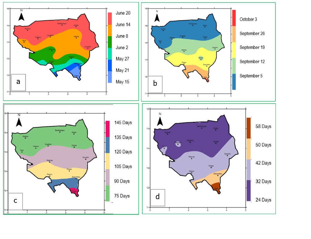 In this study, the agroclimatic parameters include start, and cessation dates of the rainy season, length of the rainy season and number of rainy days in the season. Our results revealed that the average start date of the rainy season varies along a North-South gradient (Figure 6a). On the same latitude, it is earlier in the East than in the West. In the extreme South (south of latitude 14° in the areas of Tillaberi, Ayorou, Doutchi and Bankilaré), the first rains are observed on average between June 14 and June 20. In the center (Téra, Niamey, Tamou and Dosso), the first rains are recorded at the latest in the first half of June (June 2 to June 14). The earlier start dates of the rainy season are observed on latitude 12° between by May 13 and 21 in the Gaya department. The average start date of the rainy season for the study area is June 9 with a standard deviation of 9 days. Regarding the cessation date of the rainy season (Figure 6b), it starts on average in the first decade of September in the north of Tillaberi region (Tillaberi, Téra, Ayorou). At the center of the study area between latitudes 13° and 14°, the rainy season ends between September 12 and 26, while, in the South, (Falmey and Gaya), it varies between 3 and 26 October. Furthermore, the overall average cessation date of the rainy season corresponds to September 18 with a standard deviation of 8 days. Our findings revealed that the length of the rainy season increases from North to South (Figure 6c). It varies from 75 to 90 days in the north of the Tillaberi region (Ayorou, Tillaberi, and Téra). At the center of the study area located between latitude 14° and 13° (Niamey, Doutchi, Dosso and Tamou), the rainy season lasts between 90 and 120 days. In addition, in the extreme southeast, the length of the rainy season remains longer and can reach 145 days. The results showed that the average length of the rainy season for the entire study area is 103 days with a standard deviation of 16 days. As for the number of rainy days (Figure 6d). It remains very weak (between 24 and 31 days of rain) in the north of the regions of Tillaberi and Dosso (Ayorou, Bankilaré, Ouallam) except the departments of Tillaberi and Téra. Most of the area between latitudes 12.3° and 14° indicates that the number of rainy days varies between 32 and 49 days (Niamey, Doutchi, Dosso, Tamou). It is in the extreme south of Dosso region (Gaya), that the number of rainy days remains the greatest (between 50 and 58 days) [16]. We found that the average number of rainy days in the study area is 35 days with a standard deviation of 7 days. Furthermore, agricultural production in West Africa remains particularly vulnerable to the start and end dates of rainy season as well as to the variability of the length of the season (Dodd et al., 2001).