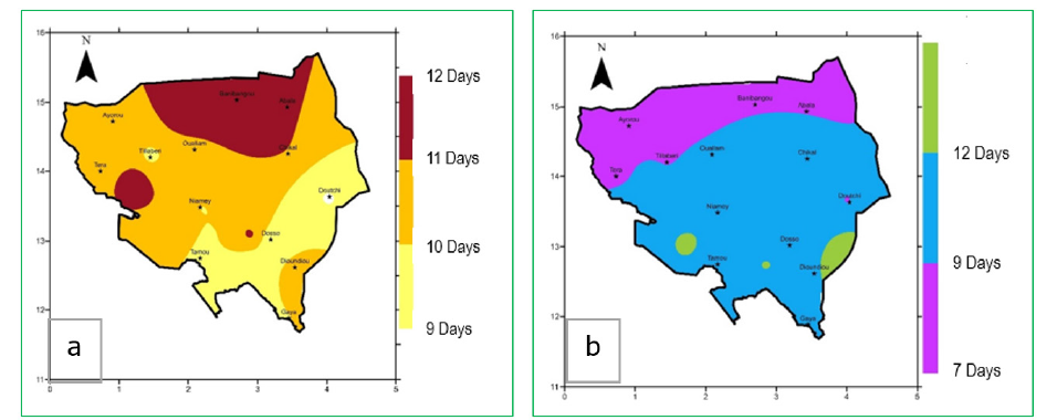 Figure 7:Average length of the longest dry spells at the beginning (a) and end (b) of the season in the Nger river regions.