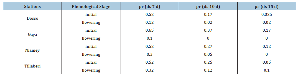 Table 1:Probability (pr) of having dry spells (ds) of 7, 10 and 15 days at initial and flowering stages of pearl millet in the river regions.