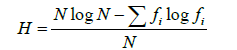 Where H=index of species diversity/degree of uncertainty, N = total number of individuals, f1 = proportion of total sample belonging to ith species