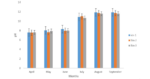 During the study period, the mean pH across the stations ranged from 9.56±0.42 in station 3 to 9.76±0.81 in station 1. Across the months, April had the least concentration with 7.59±0.015while September was highest with 11.72±.027as shown in Table 1 and Figure 1. A One-Way Analysis of Variance (ANOVA) showed that the difference in mean pH between stations and months were not significant at (p>0.05).