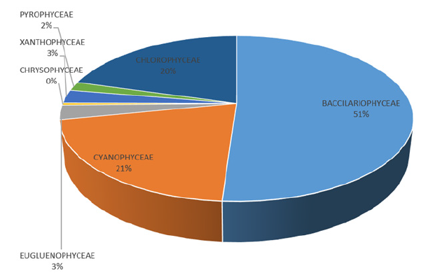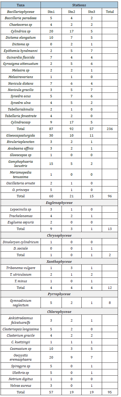 Phytoplankton: The phytoplankton recorded during the study are presented in Table 2 and Figure 10. The results revealed a total of four hundred and twenty-seven (427) across the study area, and a total of two hundred and twenty-three (223) in station 1, One hundred and forty-one (141) in station 2 and ninety-eight (98) in station 3 belonging to seven (7) taxonomic groups. The diatoms (Bacillariophyceae) were the most dominant with 51%, followed by Cyanophyceae with 21% and Chlorophyceae (20%), while the least dominant groups are Xanthophyceae and Euglenophyceae with 3% each, Pyrrophyceae (2%) and Chrysophyceae (0%) as presented in Figure 10. A total of forty-four (44) species from 7 taxonomic groups were observed. Bacillariophyceae had the highest number (17) followed by the Chlorophyceae (10), Cyanophyceae (8). The least number was from Pyrrophyceae was represented by 1 species. In terms of station abundance, Bacillariophyceae were 87 for station 1, 92 for station 2, 57 for station 3 making a total of 236 individuals of diatoms. This was followed by Cyanophyceae with 96 individuals consisting of 60 for station 1, 21 for station 2 and 15 for station 3, while Chlorophyceae was made up of 57 for station 1, 19 for station 2 and 19 for station 3 making a total of 95 individuals. Other phytoplankton taxa included Euglenophyceae which had 9 in station 1, 3 in station 2 and 1in station 3. Xanthophyceae had 4 in station 1, 4 in station 2 and 4 in station 3, Pyrrophycea had 5 in station 1, 2 in station 2 and 1 in station 3 and Chrysophyceae with only 2 individuals in stations 1 and 3. The diversity indices of phytoplankton showed that Shannon-Wiener diversity ranged between 3.153 in station 3 to 3.304 in station 1, having a stationby- station trend of Station 3>2>1. Margalef’s species richness varied between 6.668 in station 2 to 7.583 in station 1. Simpson’s Dominance (D) was between 0.944 in station 2 and 0.947 in stations 1 and 3, Evenness ranged between 0.648 in station 1 to 0.731 in station 3 (Table 3).