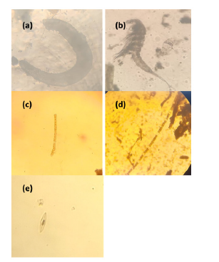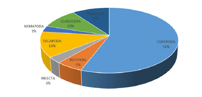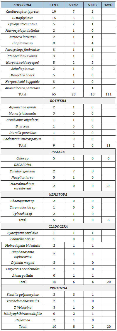 Zooplankton: The results for zooplankton recorded during the study are presented in Table 4. The results revealed a total of one hundred and ninety-nine zooplankton belonging to 8 taxonomic groups which are Copepoda 111 (51%), Rotifera 11 (5%), Cladocera 20 (10%), Protozoa 20 (10%), Insecta 6 (3%), Decapoda 25 (13%) and Nematoda 6 (3%) (Table 4) and (Figure 11). The abundance of zooplankton obtained at each station during the study period were one hundred and thirteen (113) in station 1, fifty-four (54) in station 2 and thirty-two (32) in station 3 belonging to groups (8) and 36 species. Copepoda showed the highest abundance at all sampling stations compared to other groups. The highest abundance of Copepoda occurred in station 1 and the least abundance of Copepoda occurred in station 3. Some identified species of copepod included Canthocaptus typreus, C. staphylinus, Cyclops strenunous, Macrocyclops distintus, Nitrocra lacustris, Nuphius diaptomus, Paracyclops fimbriatus, Ctenocalanus vanus, Harpacticoida sp, Actodiaptomus, Mesochra boeck. The Cladocerans observed were Hyocryptus sordidus, Colurella obtuse, Moinodapnia bidentata, Diaphanosoma aspinosoma, Diaphnia magna. Rotifera species include Asplancha girodi, Monostylah amata, Brachionus angularis, B. urceus, Diurella porcellus (Table 4). The diversity indices of zooplankton in the study area showed that Shannon-Wiener diversity ranged between 2.35 in station 3 to 3.302 in station 1, having a station-by-station trend of Station 3>2 >1. Margalef’s species richness varied between 4.040 in station 3 to 7.404 in station 1(Figure 12). Simpson’s Dominance (D) was between 0.869 in station 3 and 0.950 in station 1, Evenness ranged between 0.699 in station 3 to 0.755 in station 1 (Table 5).