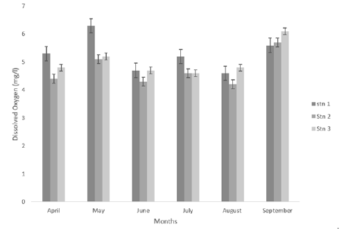 The mean dissolved oxygen across the stations was lowest in station 2 with 4.72±0.16mg/L and highest in station 1 with 5.28±0.25mg/L (Table 1) and (Figure 2). Across the months, the month of August recorded the least Dissolved Oxygen concentration 4.53±.067mg/L while the month of April recorded the highest with 4.83±0.26mg/L. Statistical Analysis of Variance (ANOVA) result revealed that there was no significant difference in the mean dissolved oxygen at (P< 0.05) across the stations.