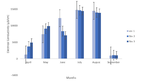 Electrical conductivity observed across the stations and months revealed that there was no much variation throughout the period sampled as presented in Table 1 and Figure 3. The Table 1 shows that the variation in conductivity values ranges from 8486.67±1490μs/ cm in Station 2 to8551.83±2587μs/cm in Station 1. The maximum mean value of 14637.00±45.67μs/cm was recorded in the month of July, while the minimum value of 3291.00±1073.13μs/cm was recorded in the month of April. One way analysis of variance revealed that conductivity is not significantly different (p>0.05) across the various stations.