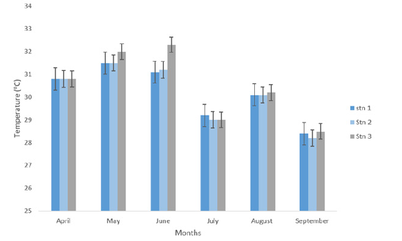 The mean monthly surface water temperature ranged from 30.13±0.36ºC in station 2-30.47±0.34 ºC in Station 3. Across the months, the highest mean temperature (31.67±0.11 0C) was recorded in the month of May, while the lowest mean temperature was observed in September (28.37±0.03ºC) as shown in Table 1 and Figure 4. An Analysis of Variance (ANOVA) showed that there was no significant difference across months and stations in temperature (p>0.05).