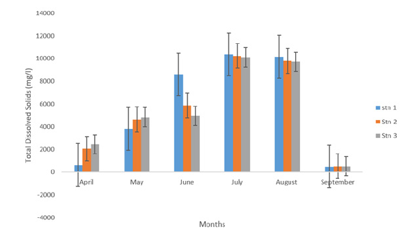 Total dissolved solids TDS concentration collected across the stations and the months revealed that there were variations throughout the period sampled as presented in Table 1 and Figure 5. The Table 1 showed that variations in TDS values ranged from 5434.03±851.98 mg/L in station 3-5681.43±1885.96mg/L in station 1. The lowest value across the months was recorded in September (511.33±3.72 mg/l) and was highest in the month of July (10246.00±32.01mg/l). One way Analysis of Variance revealed that TDS is not significantly different (p>0.05).
