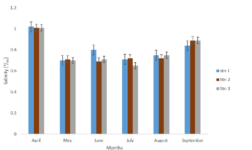 Salinity recorded across the stations and months showed slight variations throughout the study period as presented in Table 1 and Figure 6. The Tables shows that variations in salinity values ranged from 0.79±0.03ppt in station 3-0.80±0.05ppt in station 1. Monthly variation in salinity was highest in the month of April (1.01±0.00 ppt) while the minimum value 0.69±0.01 ppt was recorded in July. One way Analysis of Variance revealed that salinity in the various stations of the month sampled were not significantly different (p>0.05).