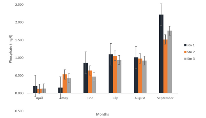 Across the stations, the concentration of Phosphate ranged from 0.775±0.127mg/L to 0.925±0.306mg/L in Stations 3 and 1. These are presented in Table 1. Across the months, Phosphate ranged from 0.15±0.02 mg/L to 1.03±0.02 mg/L in April and July as presented in Figure 7. There was no significant difference in the spatial variation of phosphate in the study area (p>0.05).