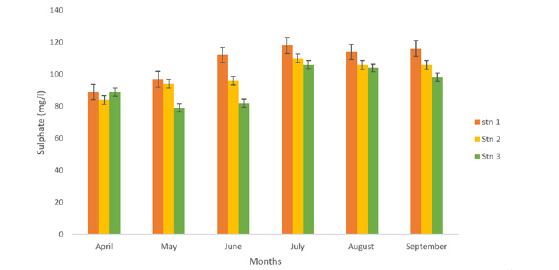 The concentration of Sulphate across the stations ranged from 93.000±2.521mg/L in station 3 to 107.667±4.821mg/L in station 1 as presented in Table 1. Across the months, Sulphate ranged from 87.33±1.67mg/L to 111.33±1.50mg/L in April and July as presented in Figure 8. A One-Way Analysis of Variance (ANOVA) revealed that there was significant difference in the concentration of sulphate across the stations (p<0.05).